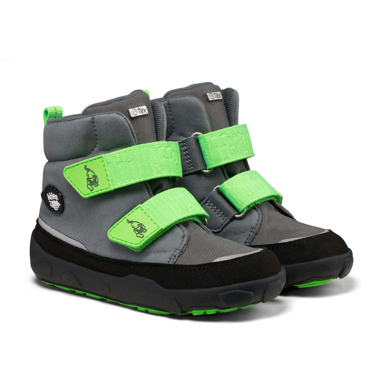 Ich bin ein gefütterter, wasserdichter Barfuß-Winterstiefel mit Kletterverschlüssen. Außerdem bin ich komplett vegan!